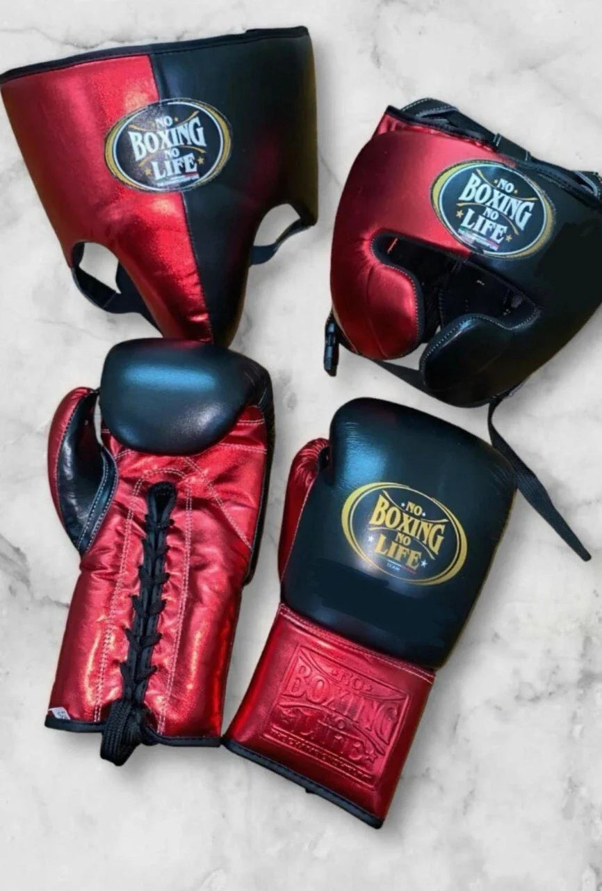 Step into the ring with the No Boxing No Life Black & Red Boxing Set, featuring professional lace-up gloves, full-face headgear, and a protective groin guard. Handcrafted in Mexico, this set is part of the championship line, built for serious fighters who demand comfort, safety, and performance.