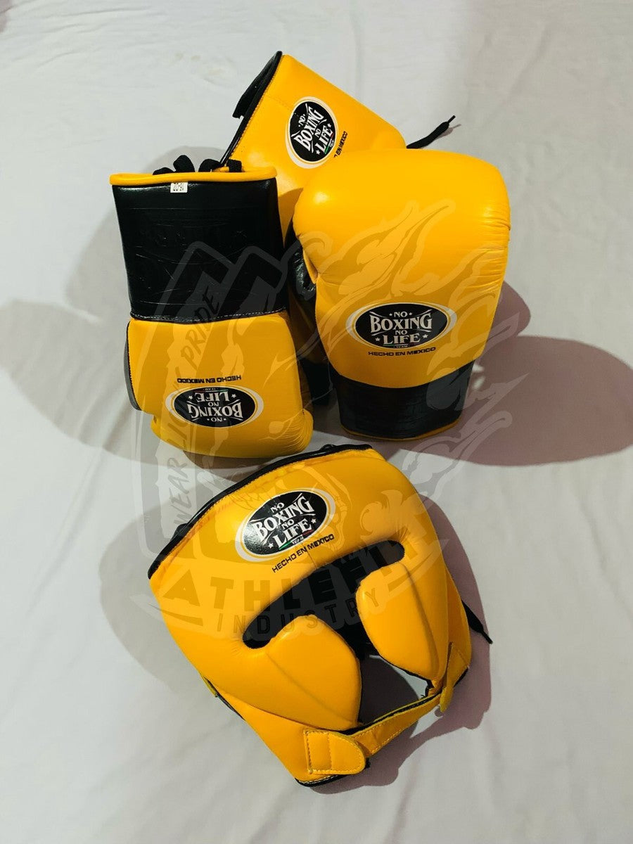 Upgrade your training with the No Boxing No Life Yellow Boxing Set, a premium protective bundle trusted by professional fighters worldwide. Handcrafted in Mexico with top-quality leather and reinforced padding, this set delivers unmatched durability, comfort, and safety for every training session, sparring, or competition.