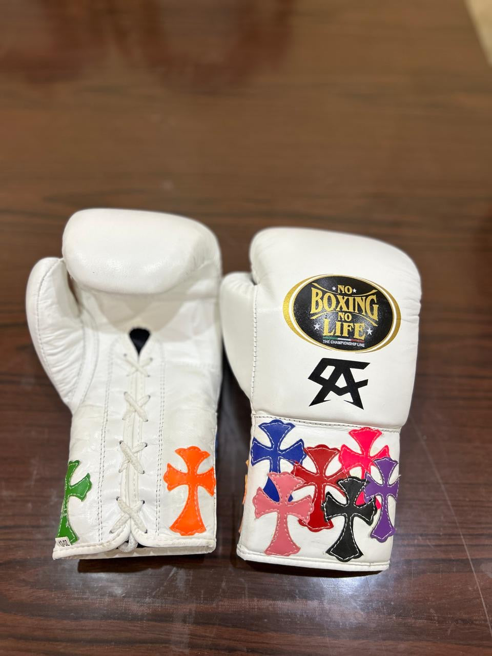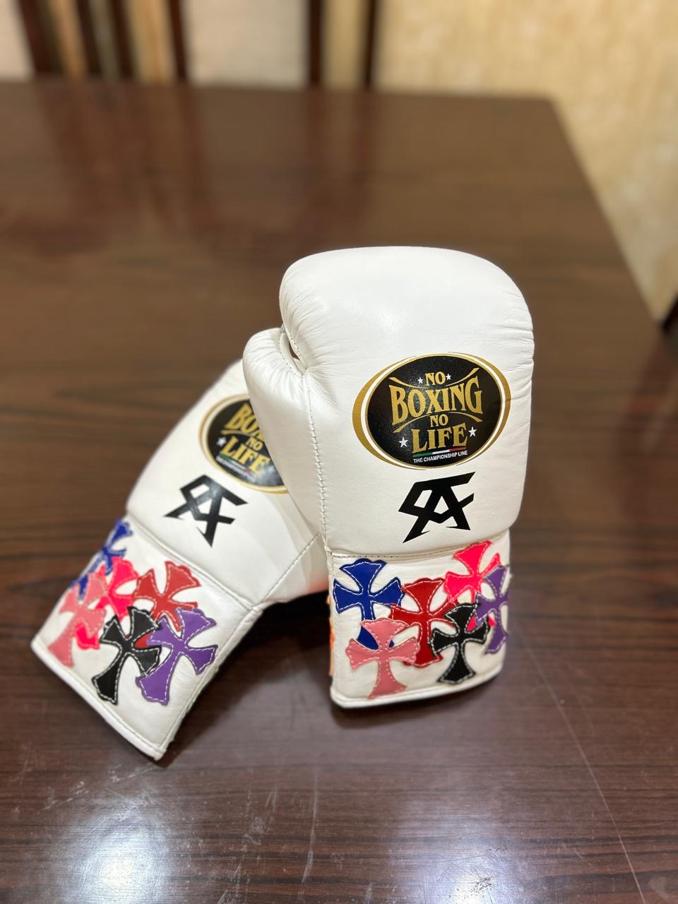 The clean white leather base combined with vibrant red and blue artistic detailing gives these gloves a unique, limited-edition look. The design reflects energy, motion and fighting spirit — making them ideal for athletes who want both performance and personality in their boxing gear.