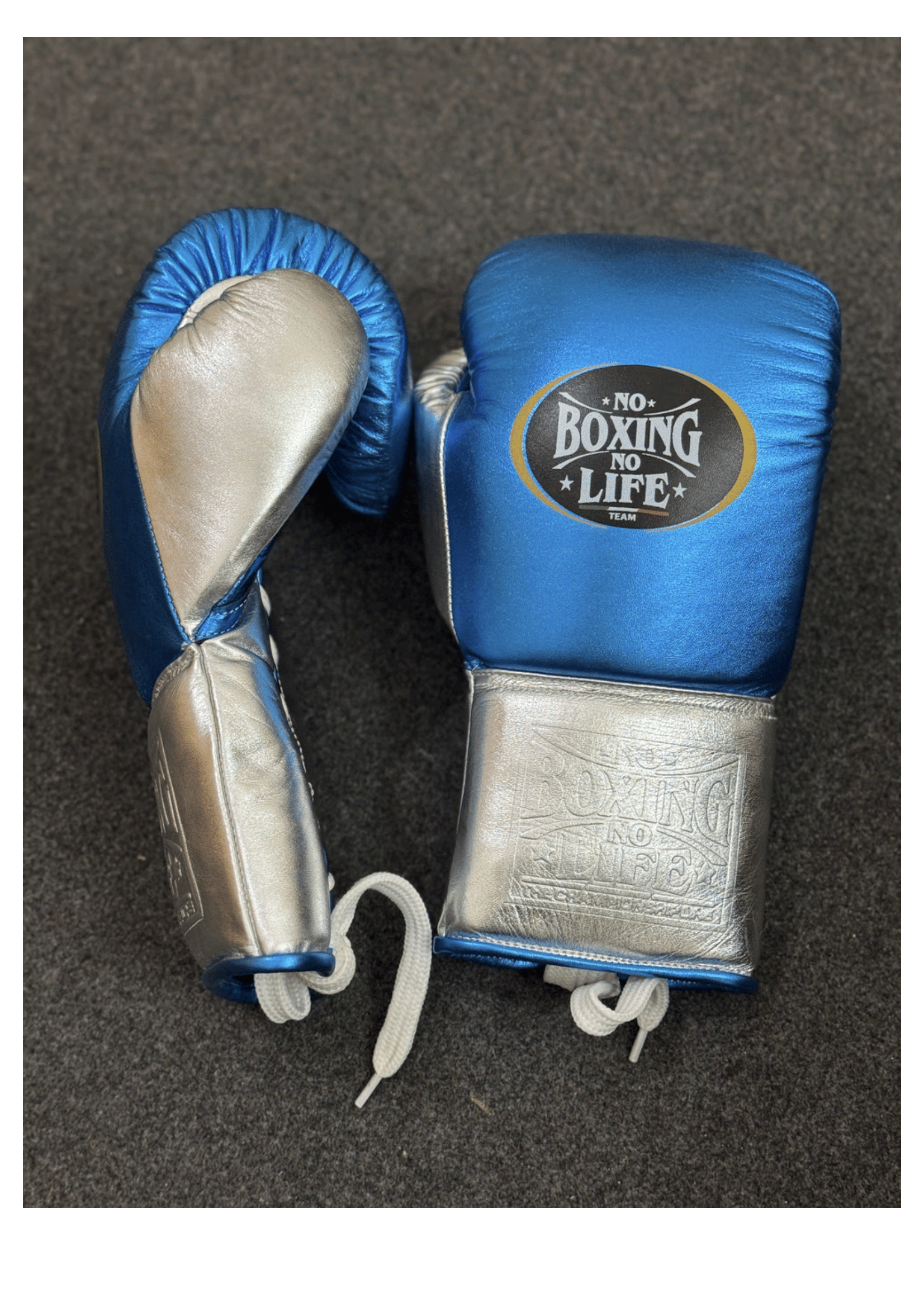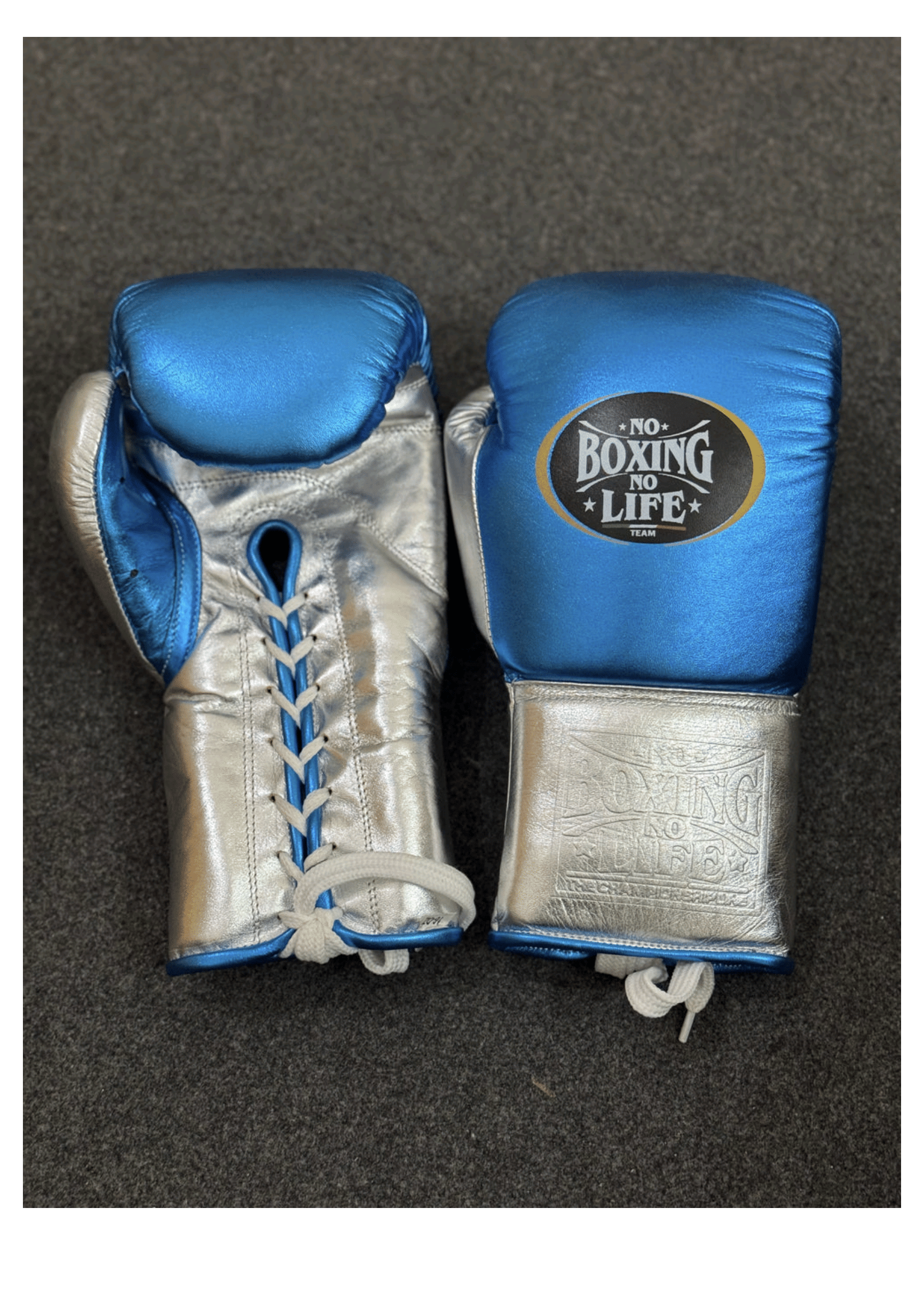 🔥 Dominate your training and fight like the pros with the No Boxing No Life Blue & Silver Lace-Up Gloves — built for champions.