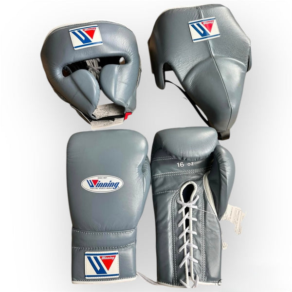 This complete set includes professional lace-up boxing gloves, full-protection headgear, and a groin protector, giving you everything you need for high-level sparring and competition preparation. The sleek matte grey design delivers a modern, professional look while providing the legendary comfort and durability that Winning is famous for.